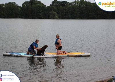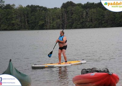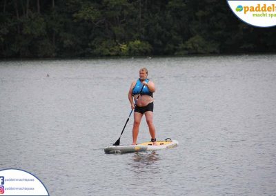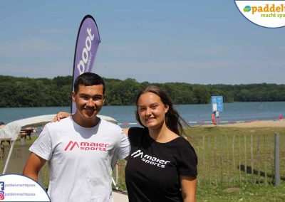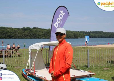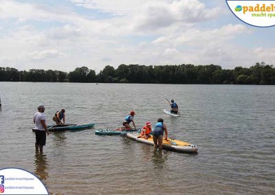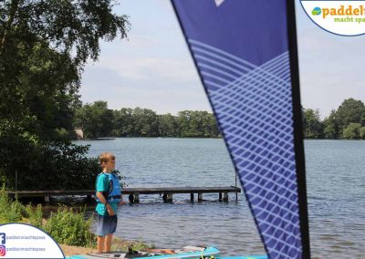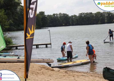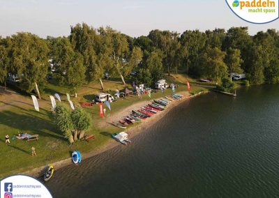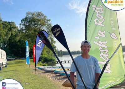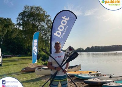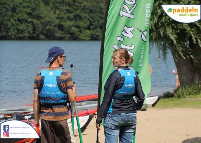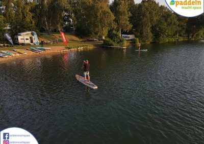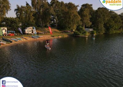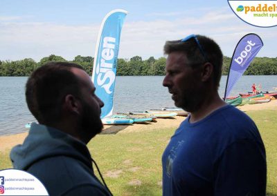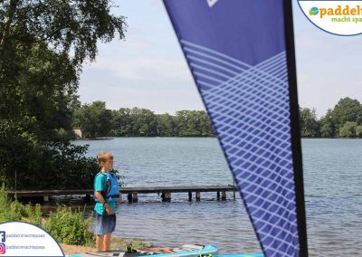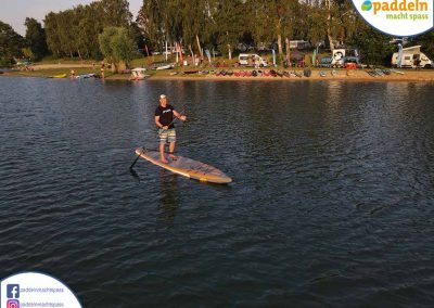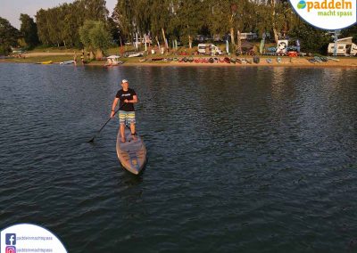 Am nächsten Morgen war es sehr windig, was aber die Urlauber nicht davon abhielt, unsere Produkte auch unter erschwerten Bedingungen zu testen. Schließlich musste man ja nur in eine Richtung paddeln, den Rückweg erledigte der Wind. Wie verabredet, war auch unser „großer Jung“ Jan pünktlich um kurz vor zehn auf unserer Aktionsfläche. Lars und er gingen zum Wasser, packten sich die passenden Boards (mit dem Manatee von Siren bekommt man auch große Jungs sicher aufs Wasser) und Lars machte mit dem „großen Jung“ die ersten Übungen auf dem Wasser. Zu Jans Überraschung standen seine ganze Familie, sowie seine Camping-Nachbarn am Ufer und beobachteten das Ganze. Jan machte seine Sache aber sehr gut und unter der routinierten Anleitung von Lars stand er sehr schnell und sicher auf dem Stand Up Paddling Board, und die beiden fuhren gemütlich über den Vierersee. Bei der Rückkehr wurde Jan von seiner Familie in Empfang genommen und ging erst einmal frühstücken. Das hatte er sich auch redlich verdient.