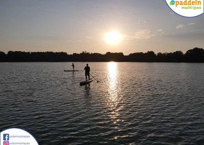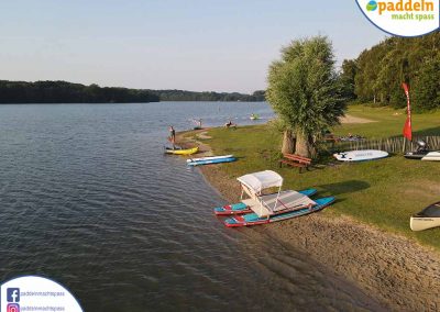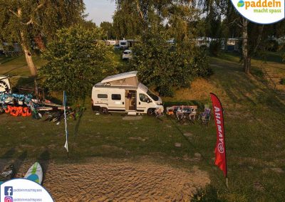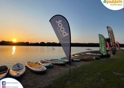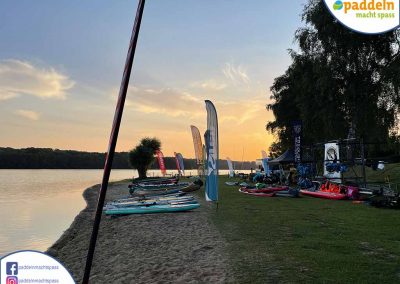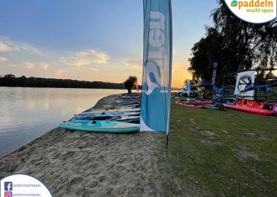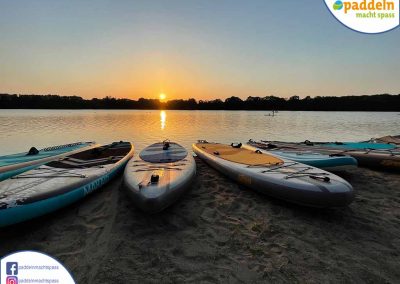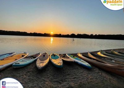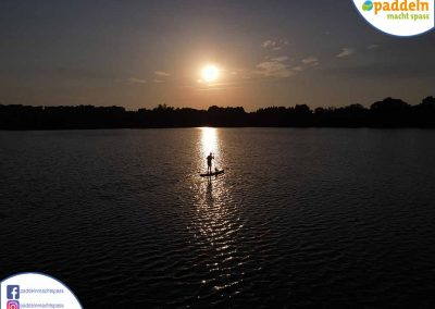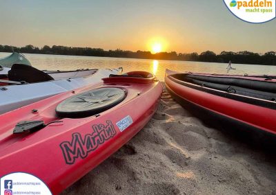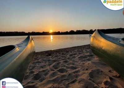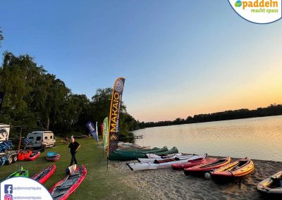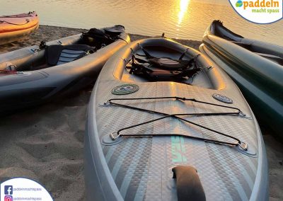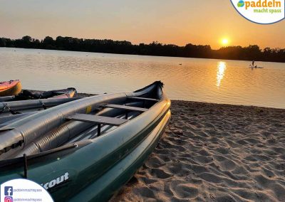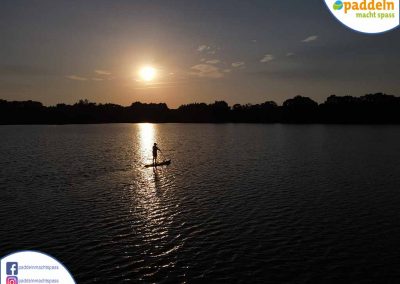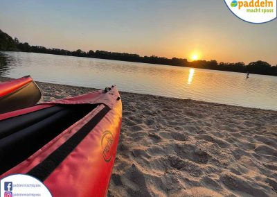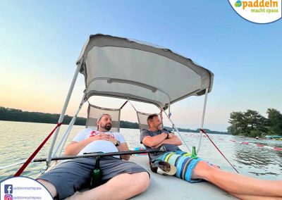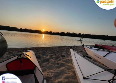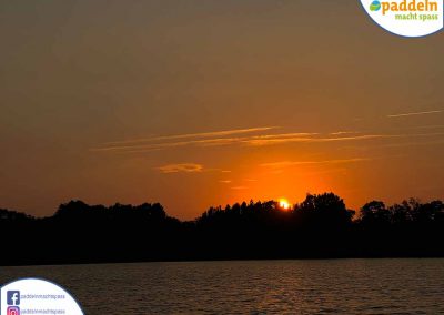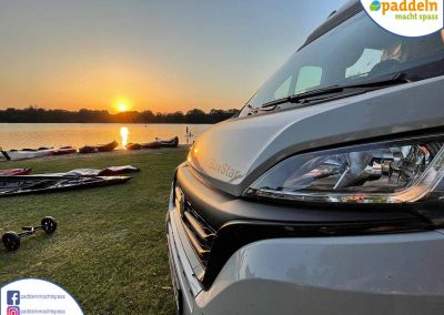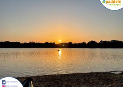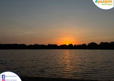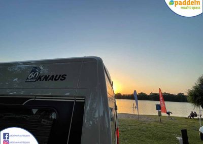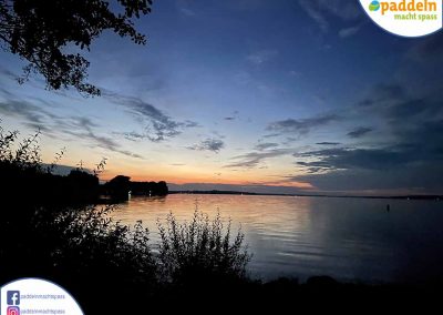 Nachdem wir weit nach 18:30 Uhr endlich Feierabend machen konnten, ging es flott unter die kalte Dusche, dann eine leckere Pizza bestellt und nach dem gemeinsamen Abendessen den Abend (natürlich, wo sonst?) auf dem Wasser genossen. Martin, Nadja, Luca und Lars paddelten mit SUP, Kanadiern und Kanus über den See, während Mira, Bibi und Felix sich mit dem Contiki-Cruiser vom immer stärker werdenden Wind treiben ließen. Später übernahmen Martin, Lars und Luca den Cruiser und fuhren nur 50 Meter weiter den Strand hinunter. Dort spielten ein paar Urlauber auf ihren Gitarren ein kleines Konzert am Stand. Hier gesellte sich das Team wasserseits dazu und genoß die gute Musik und den wunderschönen Sonnenuntergang, bis uns die Mücken ins Wohnmobil scheuchten.