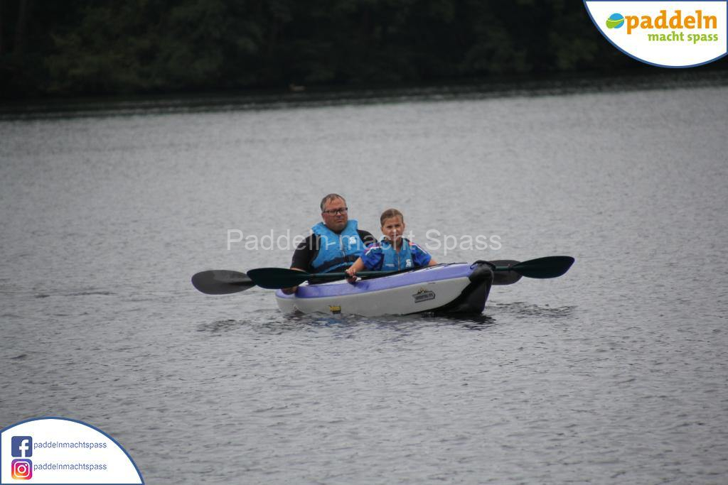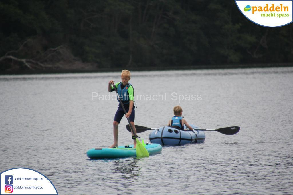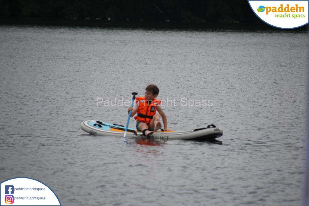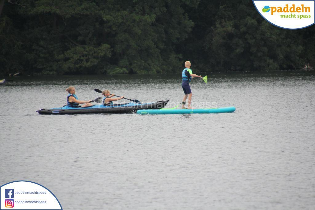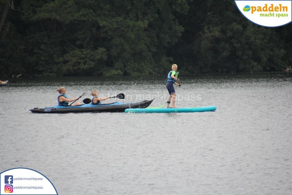 Am Nachmittag stand dann ein besonderes Highlight an: die SUP-Challenge zwischen unserem Teamleiter Lars und Thorben vom Campingplatz Augstfelde. Das Ziel: Wer fällt zuerst ins Wasser? Beide standen gemeinsam auf einem SUP-Board und versuchten, sich nur durch Gewichtsverlagerung gegenseitig ins kühle Nass zu befördern.