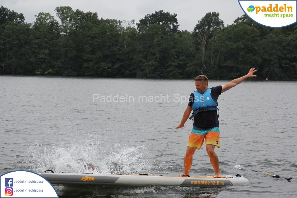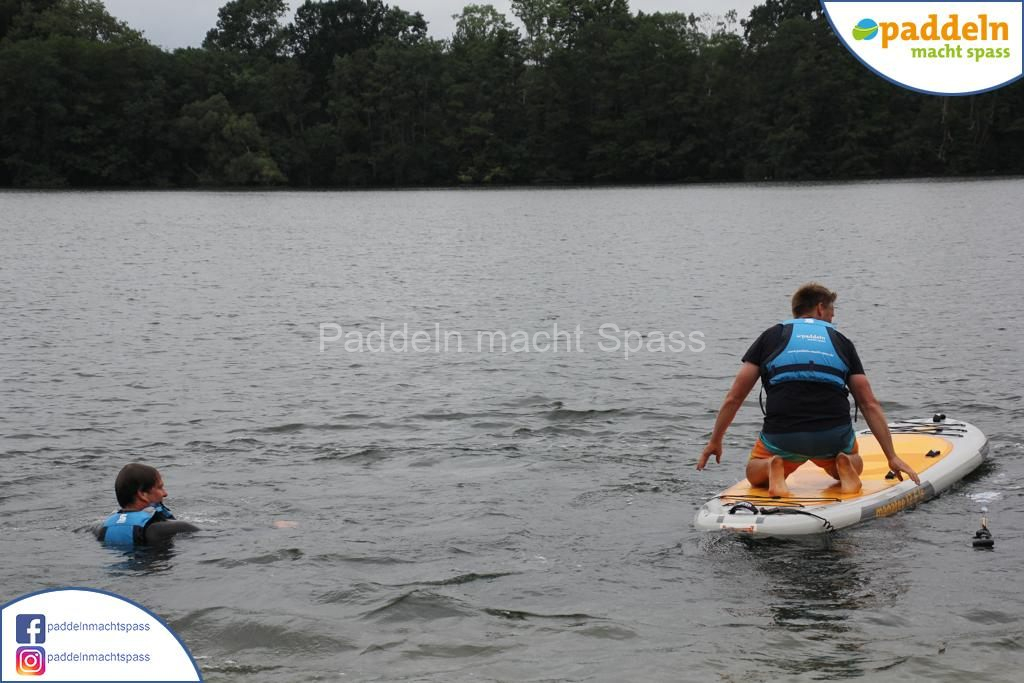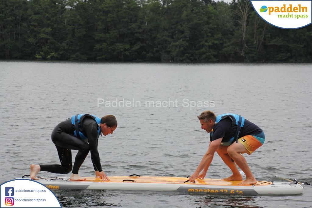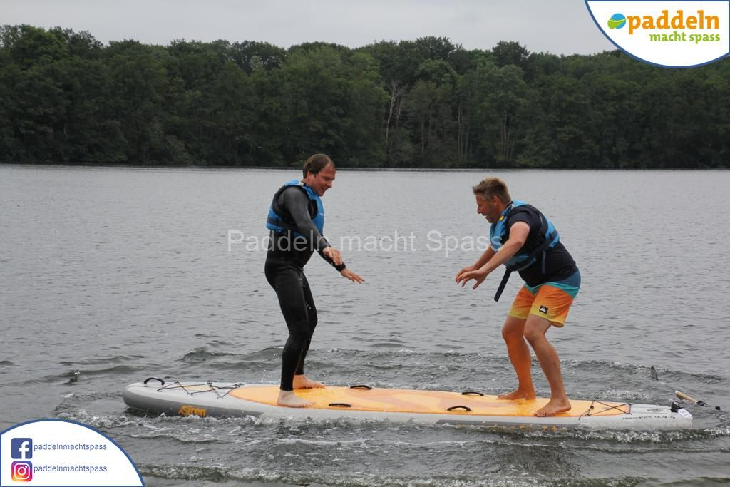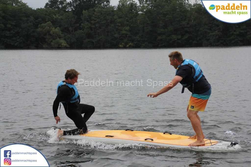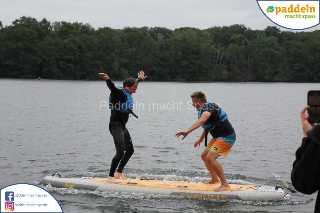 Am Nachmittag stand dann ein besonderes Highlight an: die SUP-Challenge zwischen unserem Teamleiter Lars und Thorben vom Campingplatz Augstfelde. Das Ziel: Wer fällt zuerst ins Wasser? Beide standen gemeinsam auf einem SUP-Board und versuchten, sich nur durch Gewichtsverlagerung gegenseitig ins kühle Nass zu befördern.