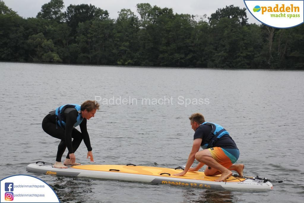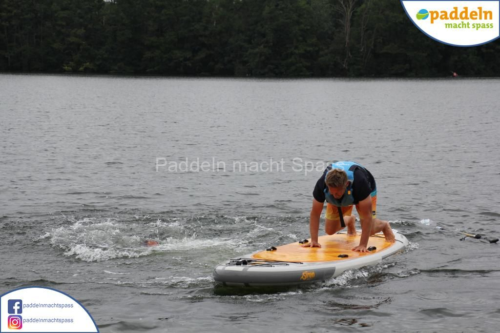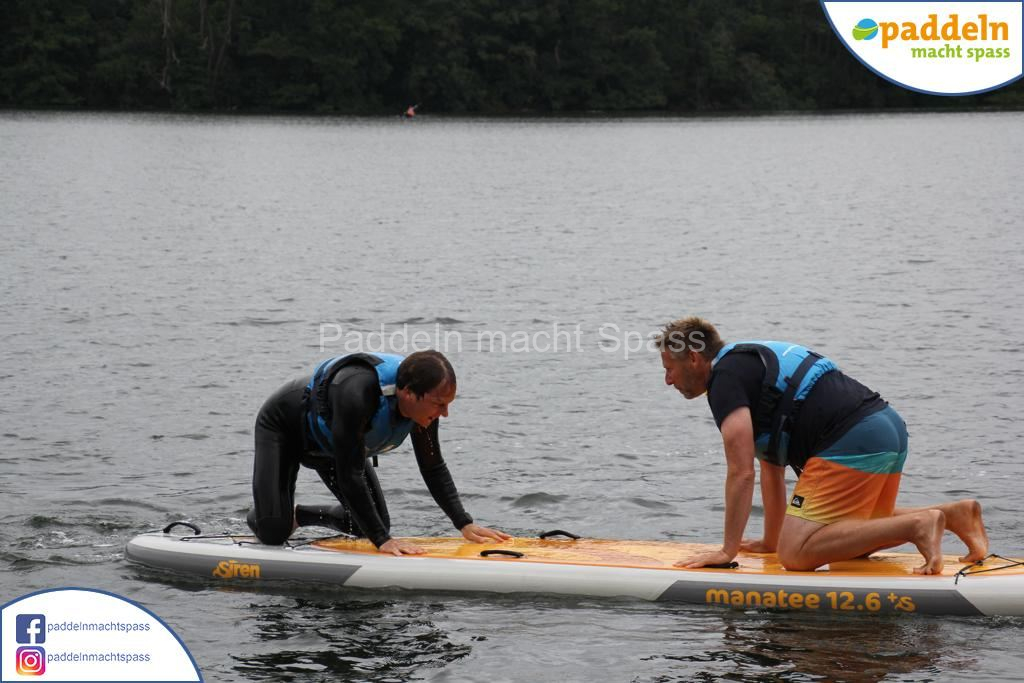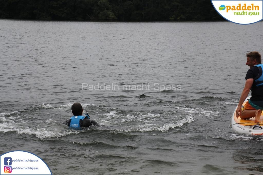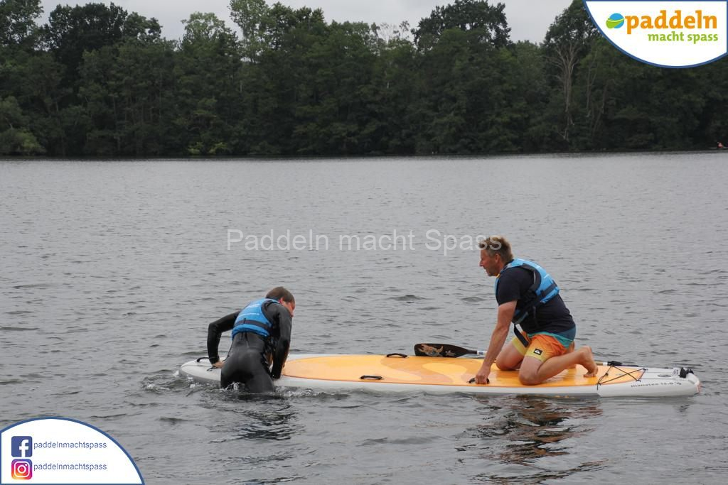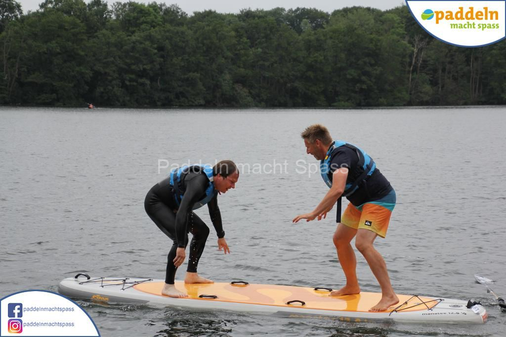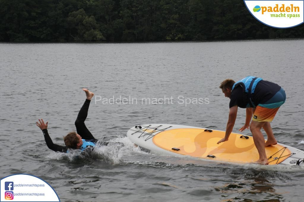 Am Nachmittag stand dann ein besonderes Highlight an: die SUP-Challenge zwischen unserem Teamleiter Lars und Thorben vom Campingplatz Augstfelde. Das Ziel: Wer fällt zuerst ins Wasser? Beide standen gemeinsam auf einem SUP-Board und versuchten, sich nur durch Gewichtsverlagerung gegenseitig ins kühle Nass zu befördern.