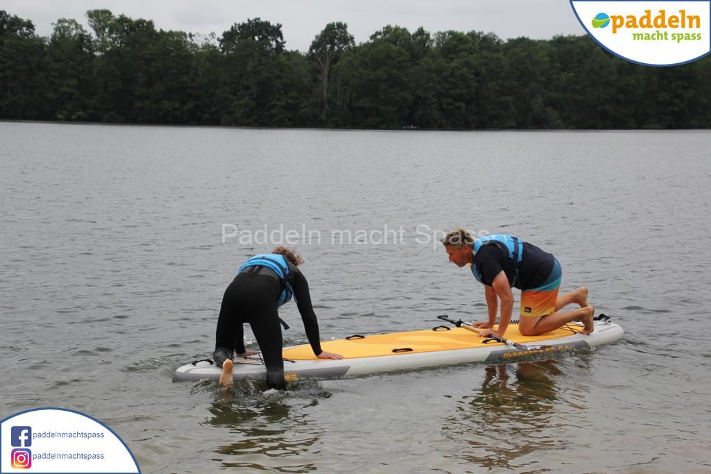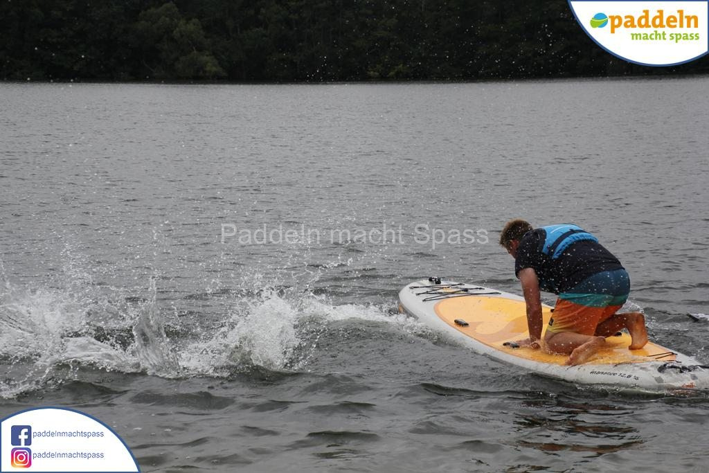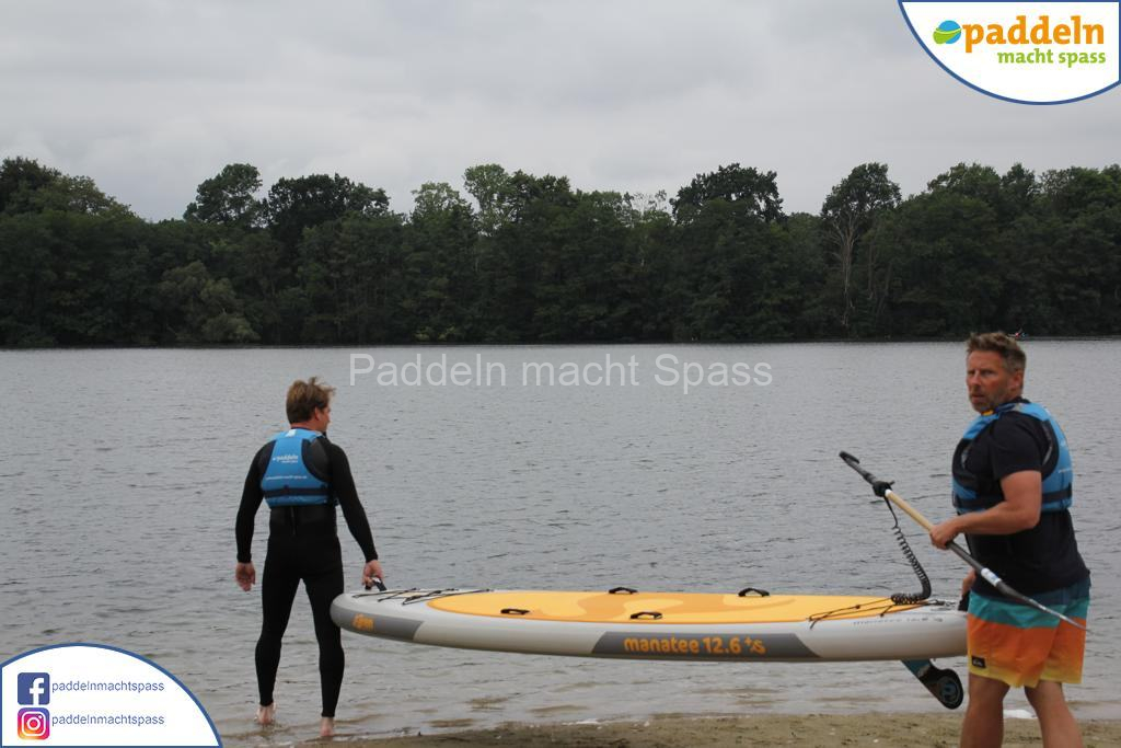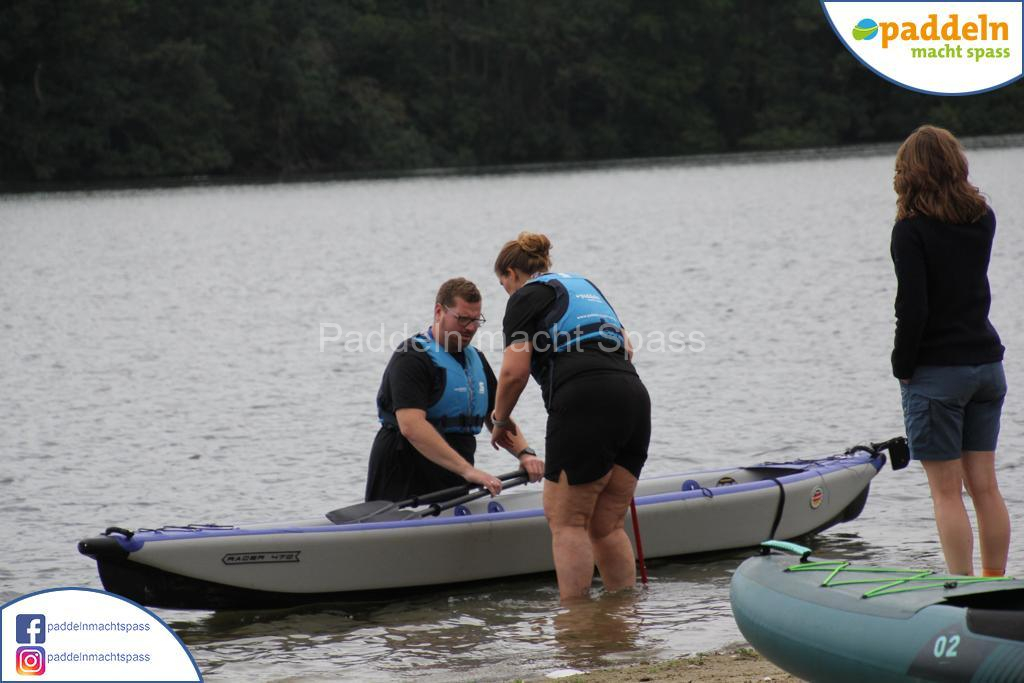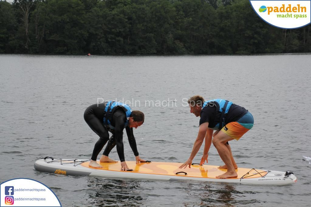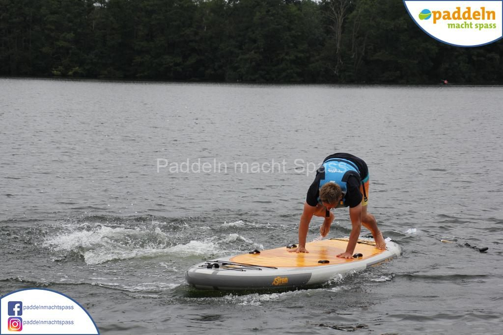 Am Nachmittag stand dann ein besonderes Highlight an: die SUP-Challenge zwischen unserem Teamleiter Lars und Thorben vom Campingplatz Augstfelde. Das Ziel: Wer fällt zuerst ins Wasser? Beide standen gemeinsam auf einem SUP-Board und versuchten, sich nur durch Gewichtsverlagerung gegenseitig ins kühle Nass zu befördern.