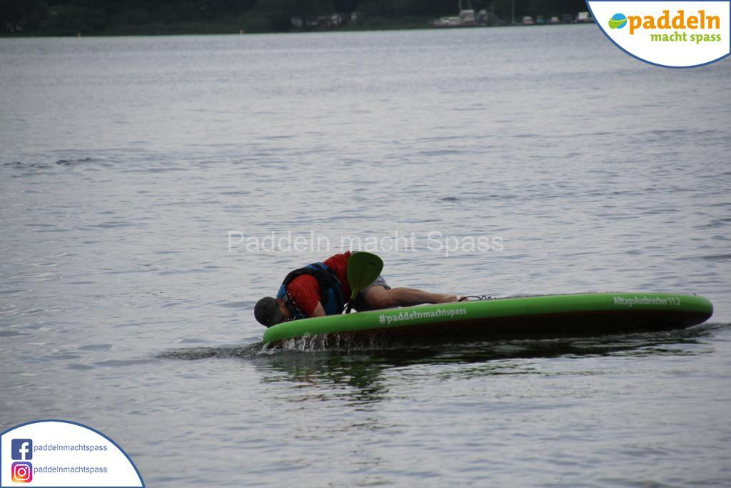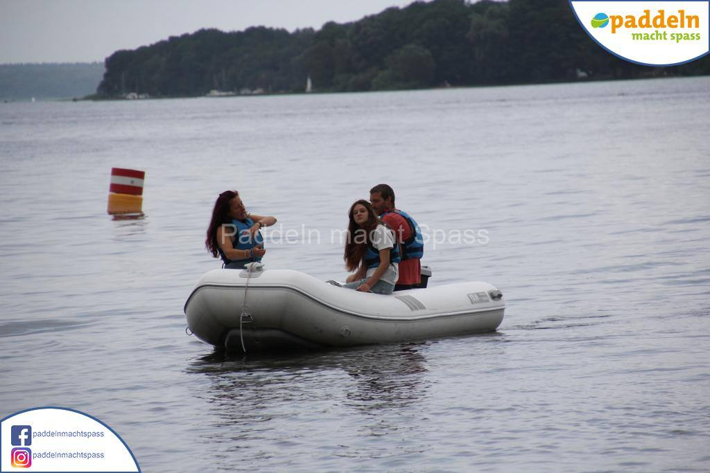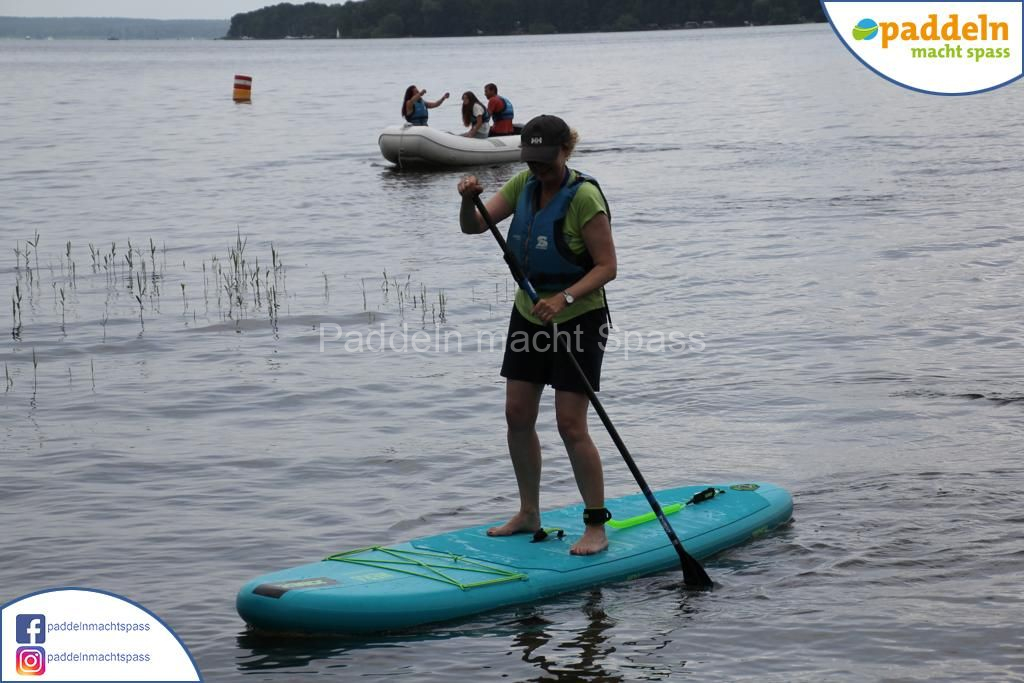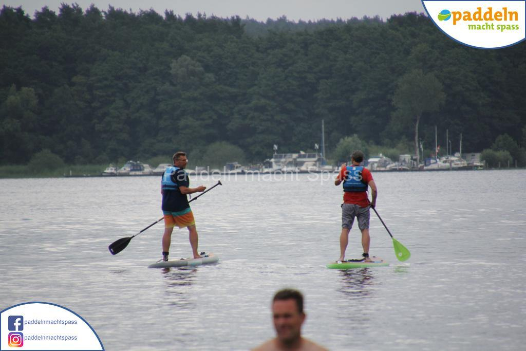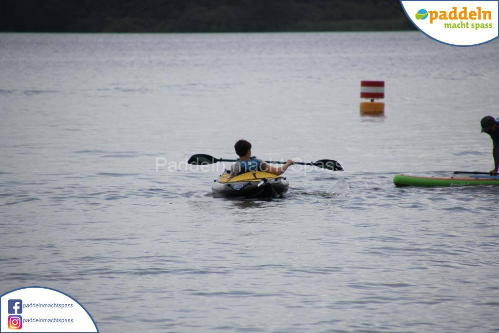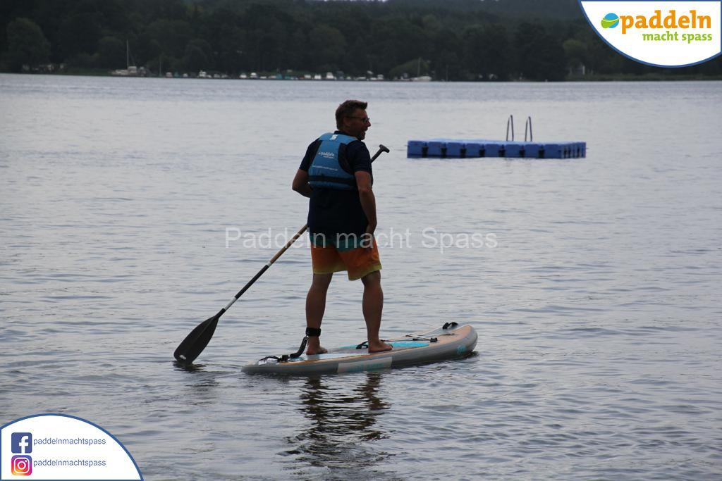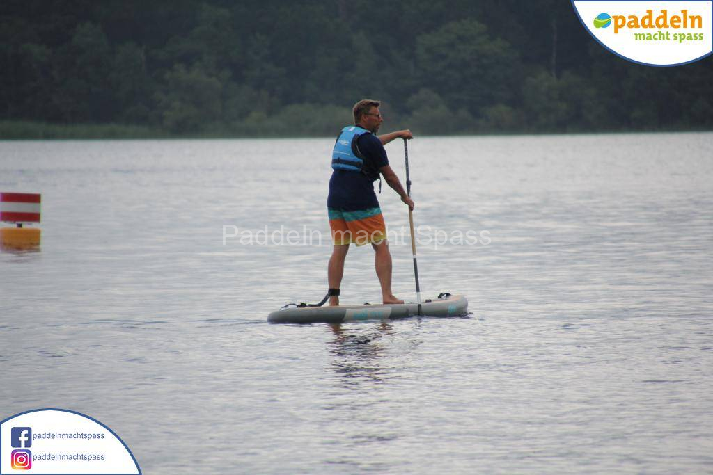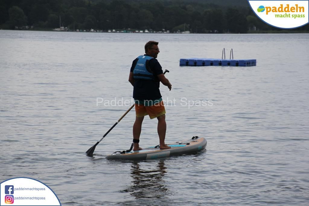 Besonders unsere Elektromotoren zogen die Aufmerksamkeit auf sich. Kein Wunder, denn das Wassersportrevier rund um den Campingpark Zuruf lädt förmlich dazu ein, auch einmal motorisiert über den See zu gleiten. Gleichzeitig wurde fleißig gepaddelt – und wie so oft waren auch Teilnehmer dabei, die zunächst selbstbewusst meinten: „Ich habe das schon mal gemacht, ich brauche keine Hilfe.“ Nicht selten endete dieser Satz dann mit einem unfreiwilligen Bad im See, sehr zur Belustigung der mitgereisten Familien und Freunde.