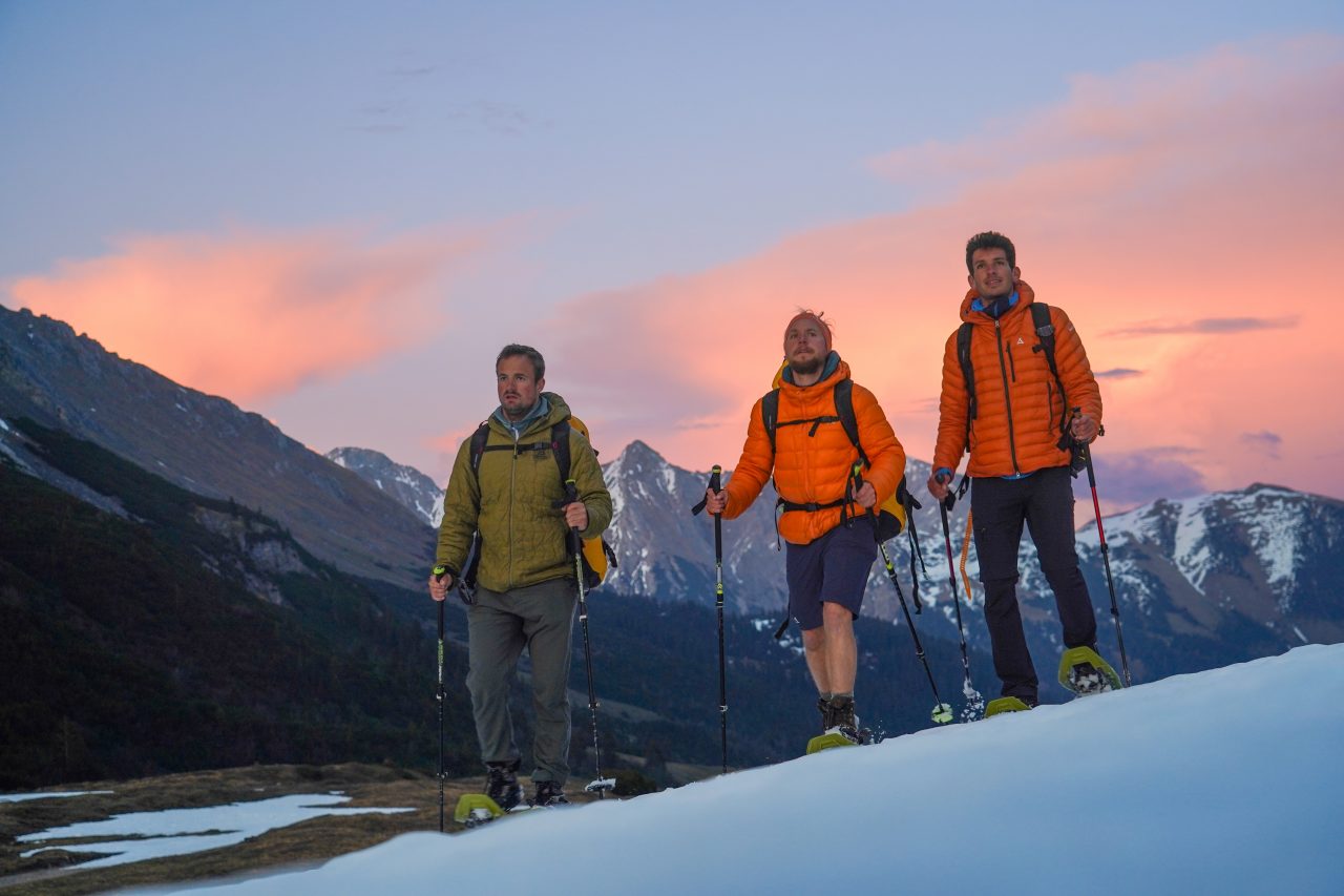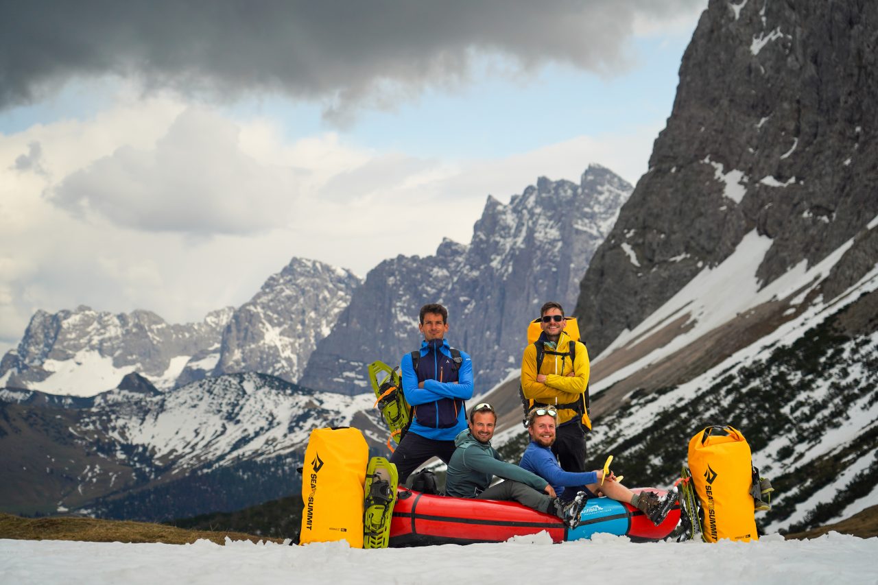Die Schneeschuhe sind auch bitter nötig, denn oberhalb von 1500 m ist noch viel Schnee anzutreffen. Am höchsten Punkt der Tour angekommen, dem 1800 m hohen Hochalmsattel, werden die Packrafts kurzerhand umfunktioniert: Die Disziplin Snowrafting wird ins Leben gerufen und schon schmeißen sich die vier in die steilen, schneereichen Nordhänge und schießen mit den Booten hinunter.
