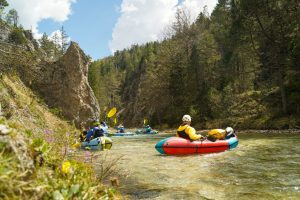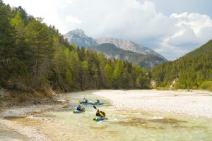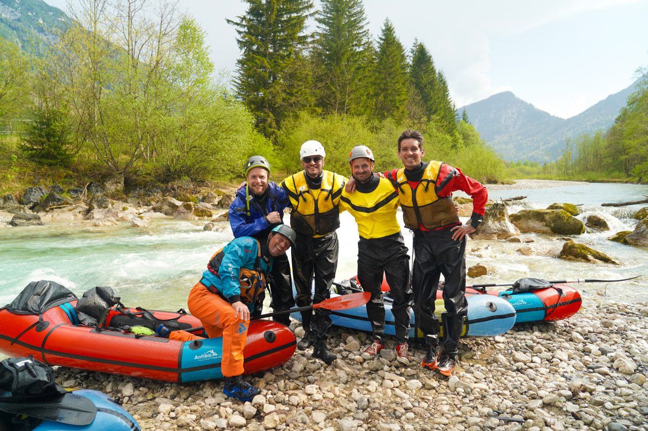 Unten angekommen wartet das finale Highlight. Auf der wilden Isar, die nur ein paar km Flussaufwärts im Karwendel ihren Ursprung hat, raftet die Gruppe durch die spektakuläre Isarschlucht hinaus bis nach Scharnitz und schließlich bis nach Mittenwald.