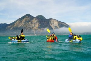 Am nächsten Tag werden die Boote wieder aufgebaut und es geht einmal quer über den wunderschönen Bergsee, auch die bayerische Karibik genannt. Rings herum schneebedeckte Gipfel des Karwendel. Am Südufer angelangt können die Boote für längere Zeit eingepackt werden, denn als nächstes steht eine zwei-tägige Karwendel Überquerung an. Aufgrund von Schnee im Gebirge, das Projekt fand im Frühjahr statt, hat die Gruppe auch Schneeschuhe mit im Gepäck, damit die Überquerung auch wirklich funktionieren kann.